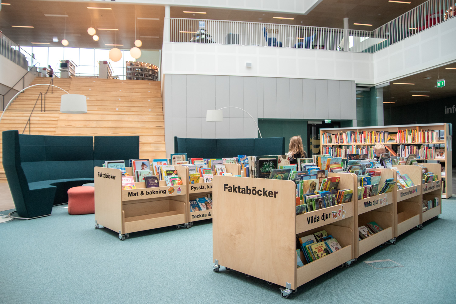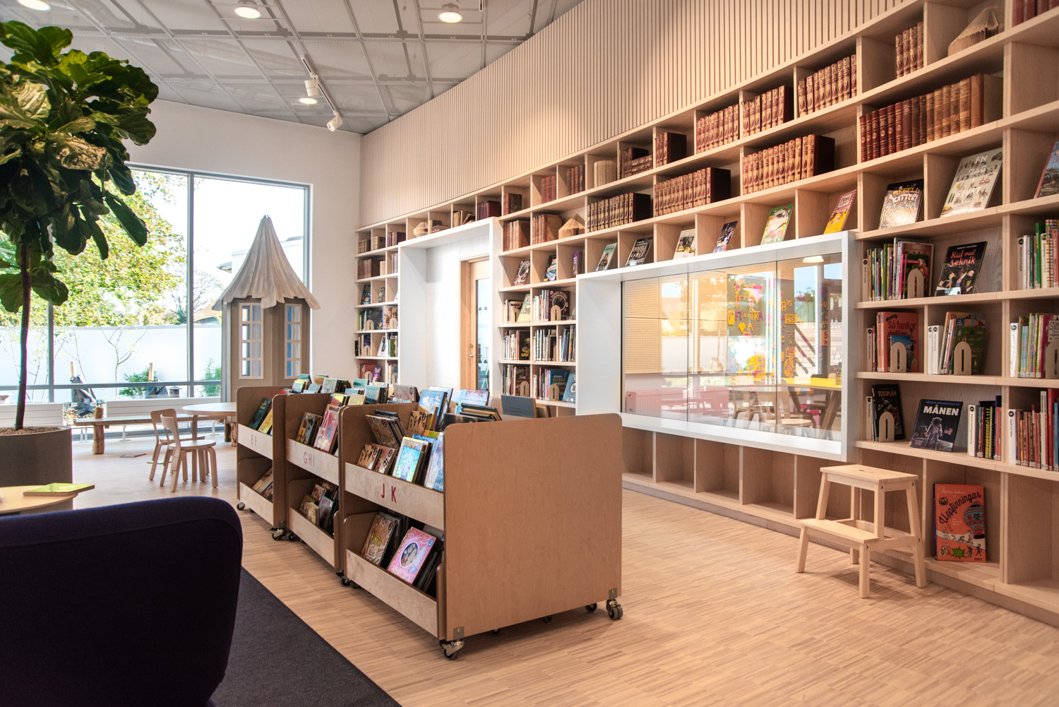 En haut, trois compartiments par section munis de séparations pour exposer les albums de face. En bas, un tiroir pratique par section monté sur roulettes, avec deux compartiments de  rangement.