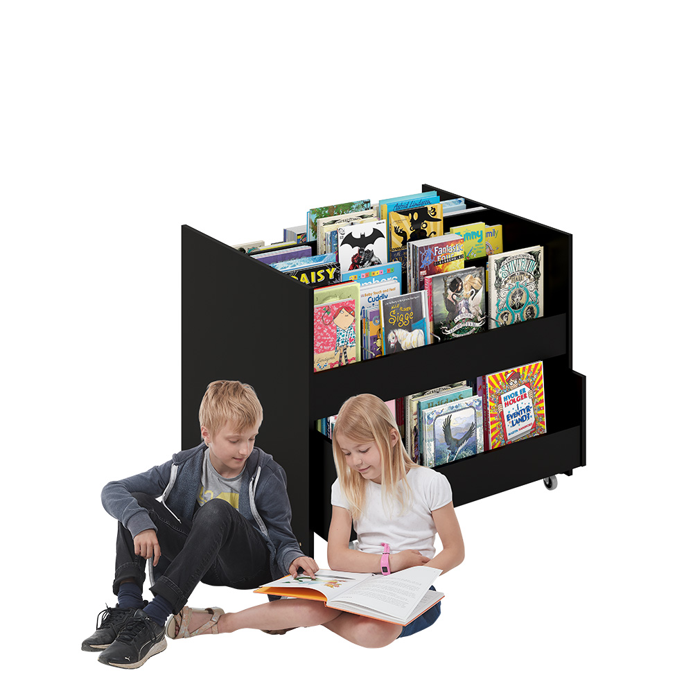 En haut, trois compartiments par section munis de séparations pour exposer les albums de face. En bas, un tiroir pratique par section monté sur roulettes, avec deux compartiments de rangement.