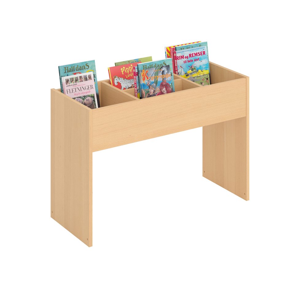 Bac à albums pour une exposition de face. Comporte trois cloisons amovibles. Peut-être équipé d'une étagère de desserte. L'étagère inférieure en hêtre et les roulettes peut être achetée séparément.