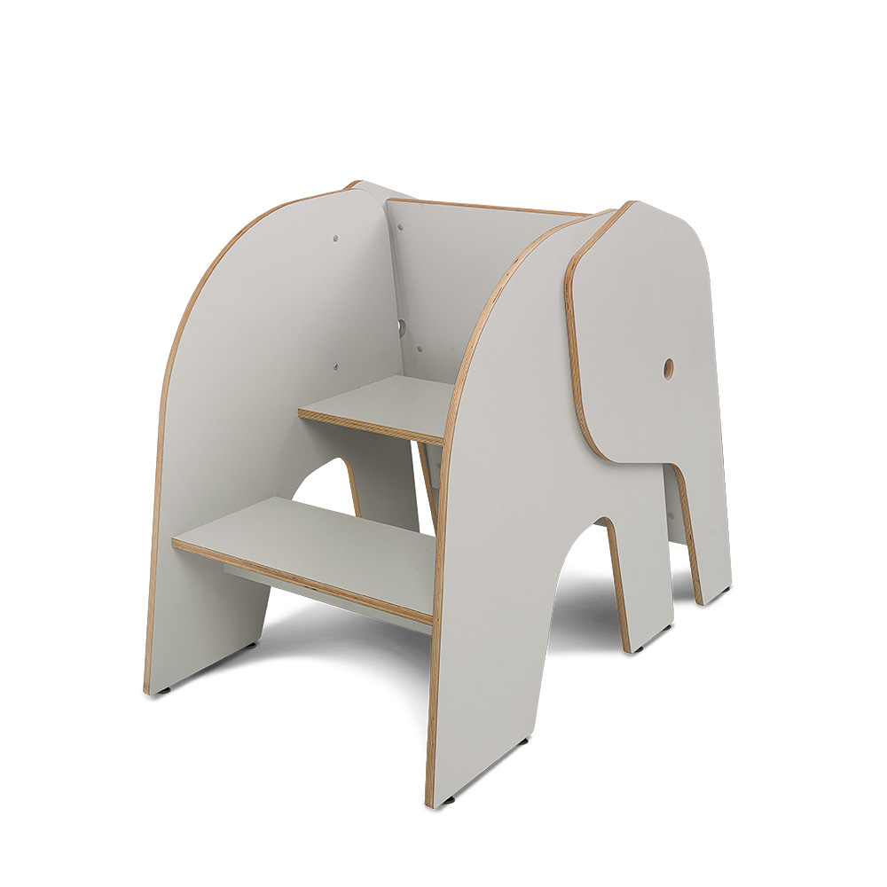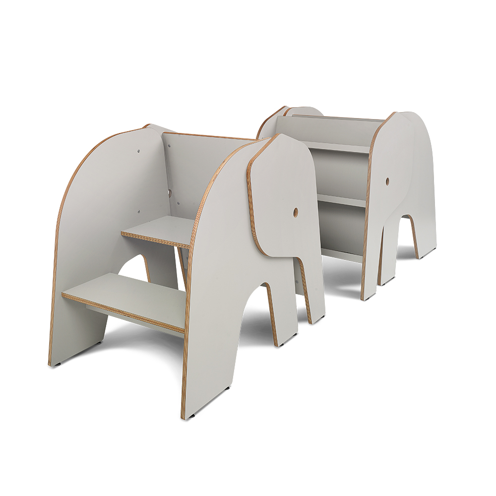 Petit Elof aide avec la charge! Elof est une version plus petite de Elna. Il aime aussi être avec les enfants et il est heureux d'être nourris avec des livres (c'est permis!). Tablettes pour exposer des livres de face (le tronc) Selon la taille des livres choisis la défense d'Elof peut être équipé de trois étagères ( peuvent être ajustées)
