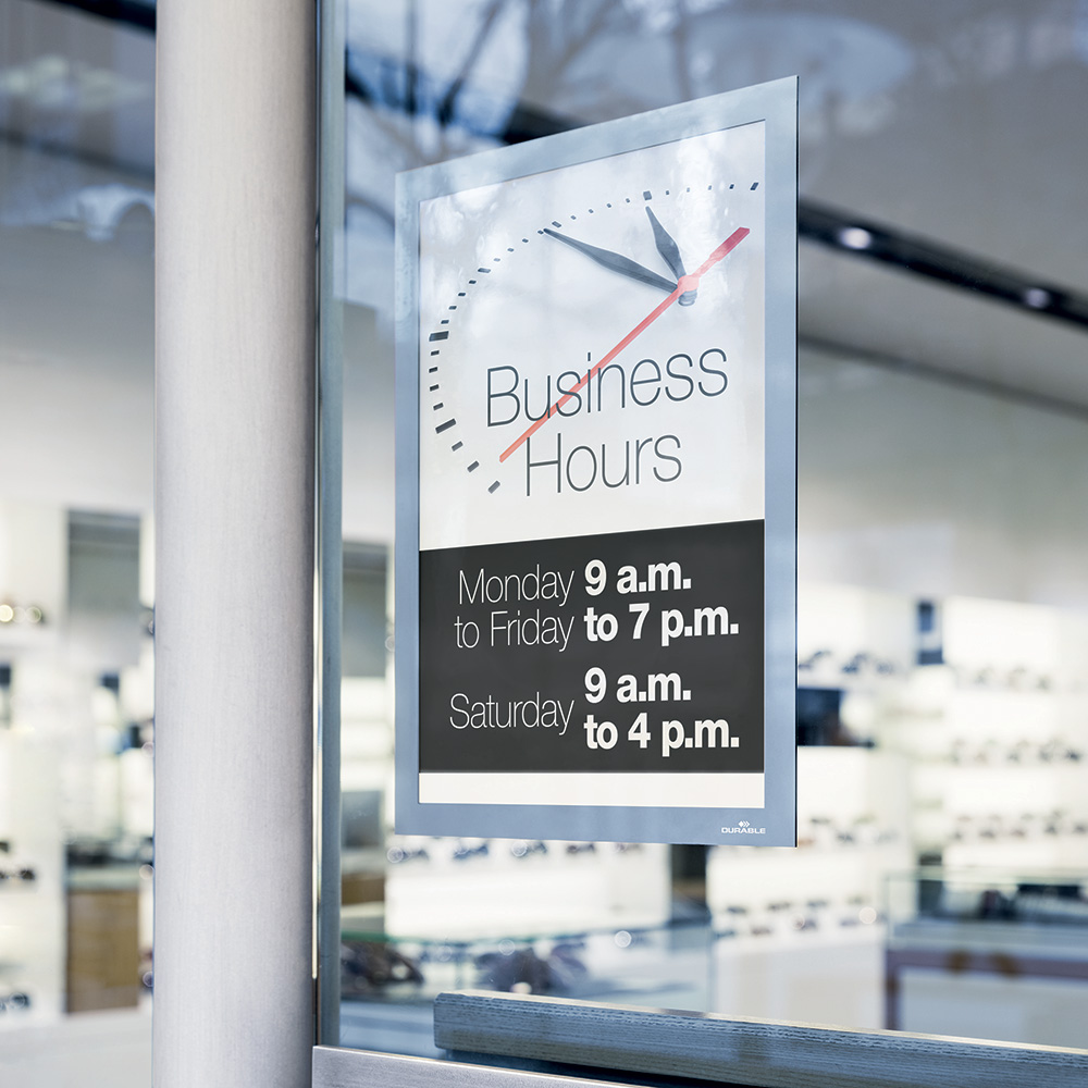 Les cadres (Duraframe® Poster Sun) adhèrent solidement au support sans colle (ce qui permet d’éviter la formation de bulles d’air). Idéal pour afficher des publicités ou des informations sur de grandes fenêtres ou d’autres supports en verre.