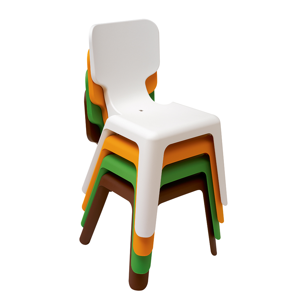 Une chaise légère et empilable avec une assise bien particulière. La face arrière du dossier est décorée d’un feuillage parsemé de petits oiseaux. La chaise est faite de fibre de verre renforcée de plastique aux couleurs représentant les quatre saisons de l’année : vert pour le printemps, orange vif pour l’été, brun pour l’automne et blanc pour l’hiver.