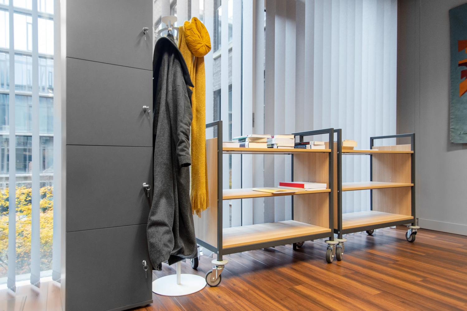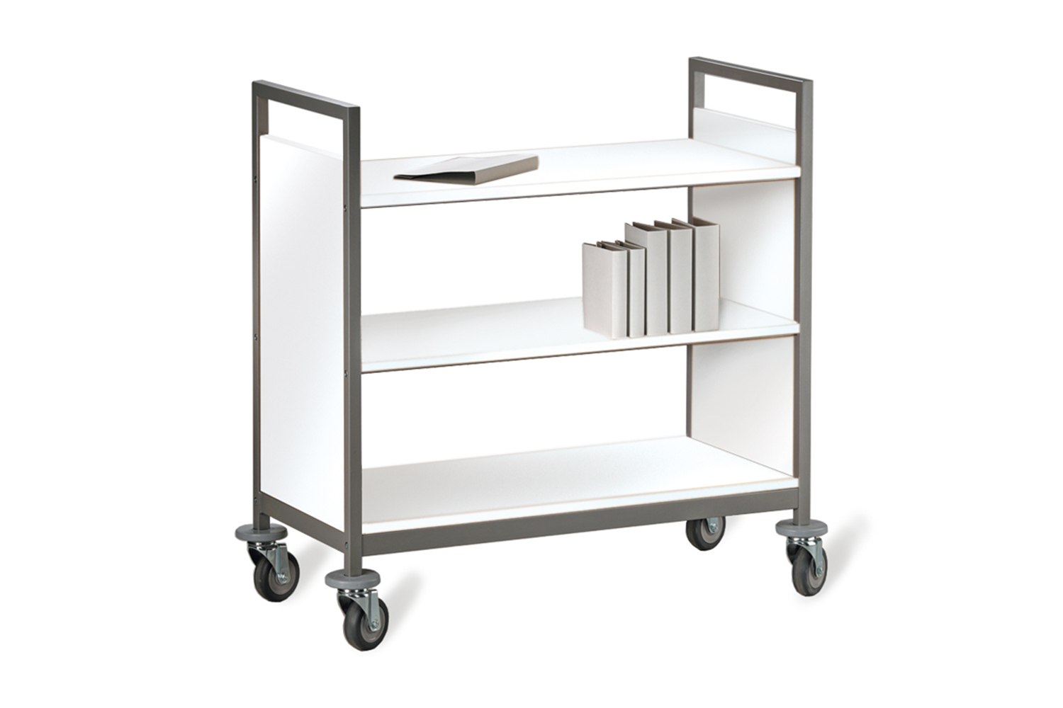 Le chariot à livres Classic Line est disponible en sept modèles et possède des roulettes avec butoirs afin de protéger les murs et les portes.