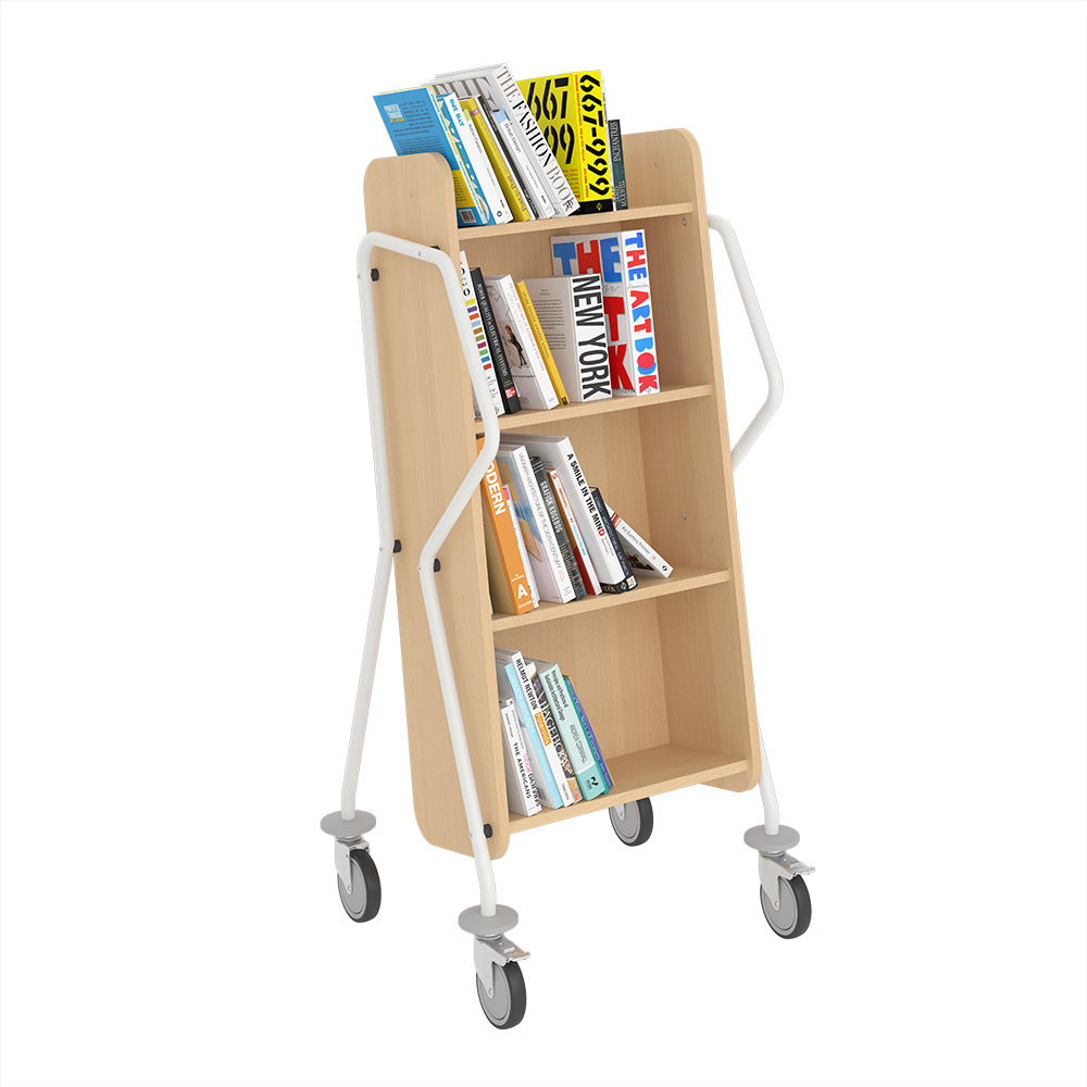 Chariot à 4 étagères fixes généreusement espacées et facilement inclinables. Convient aussi pour les livres de grand format.