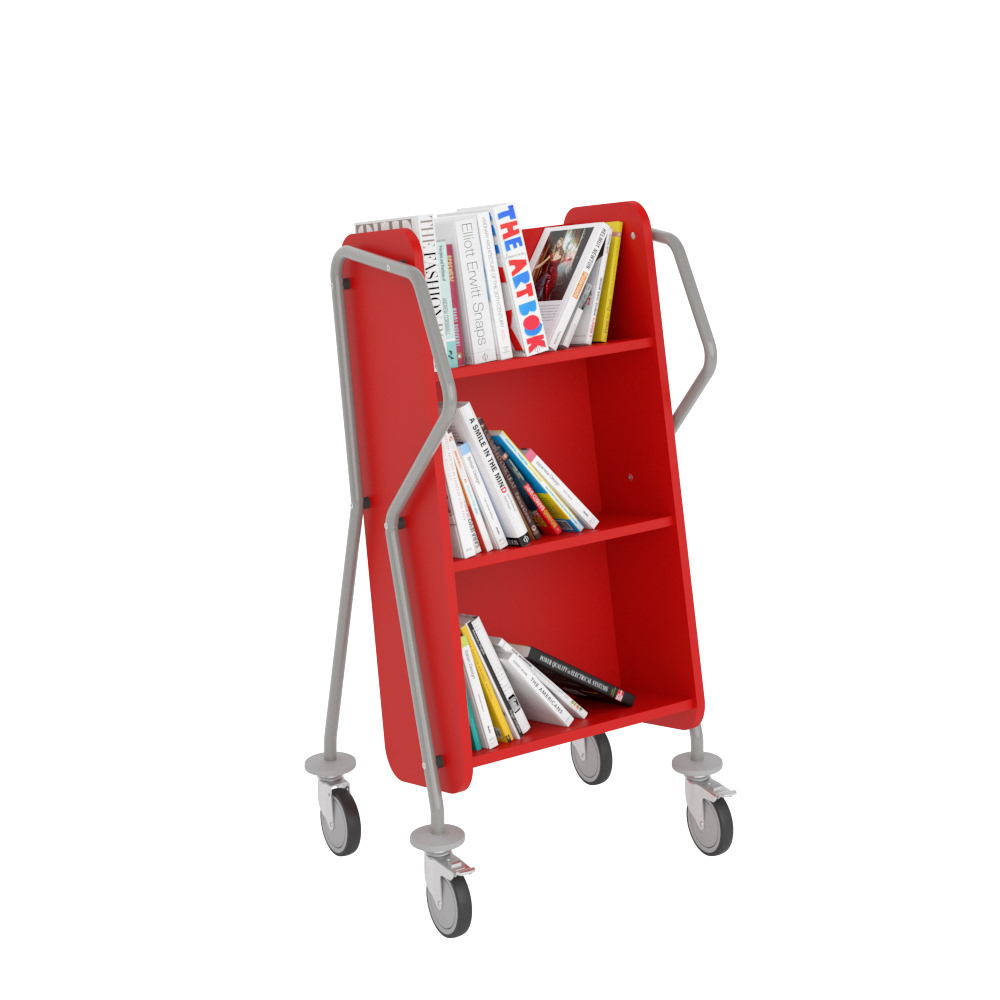Chariot à 3 étagères fixes généreusement espacées et facilement inclinables. Convient aussi pour les classeurs.