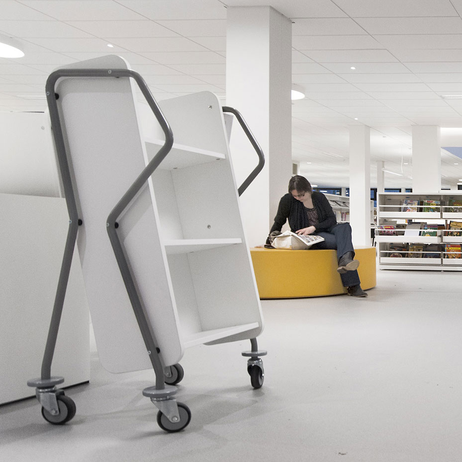 Chariot à 3 étagères fixes généreusement espacées et facilement inclinables. Convient aussi pour les classeurs.