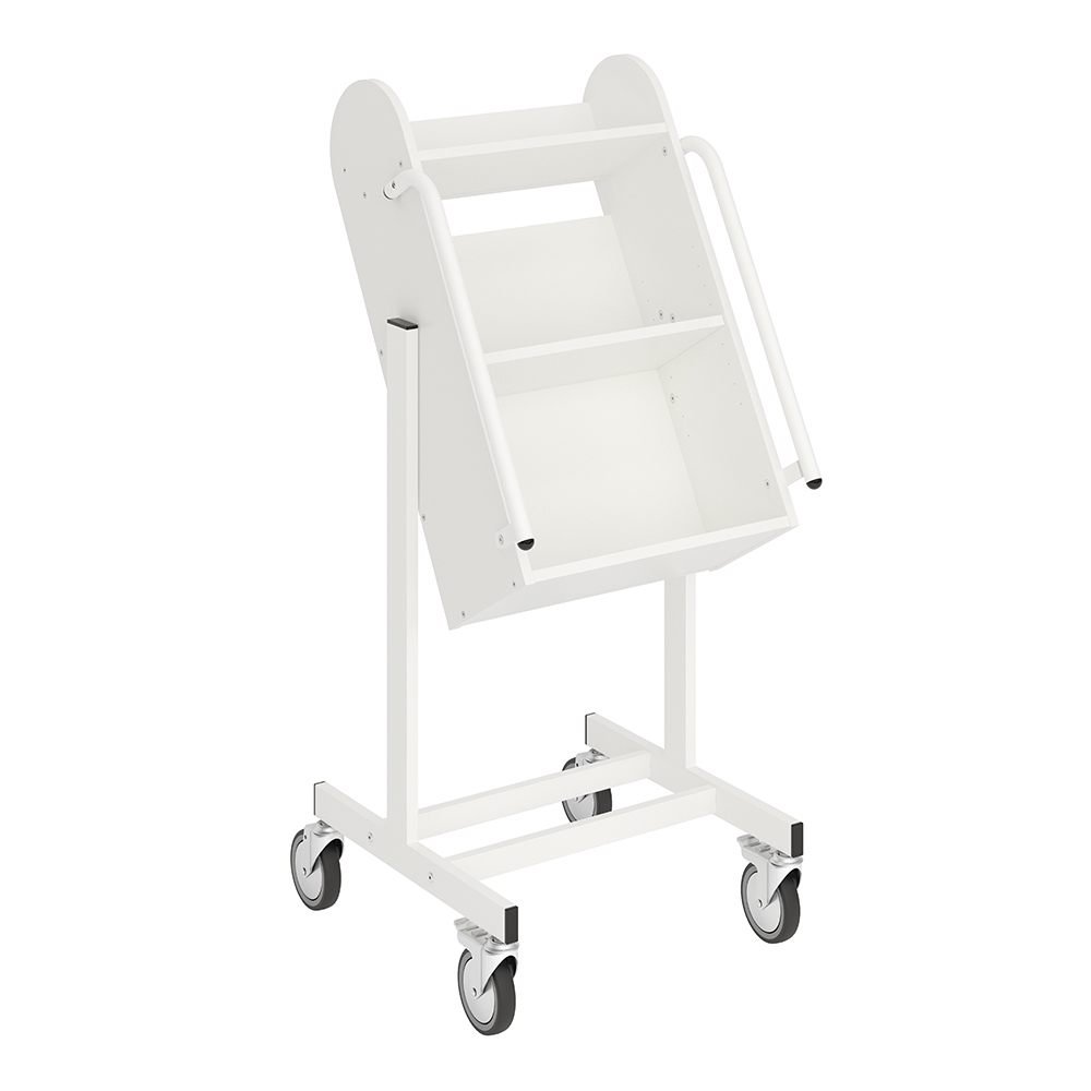 Chariot simple-face, caisson incliné avec 3 tablettes. à trois étagères, dont celle du milieu amovible.