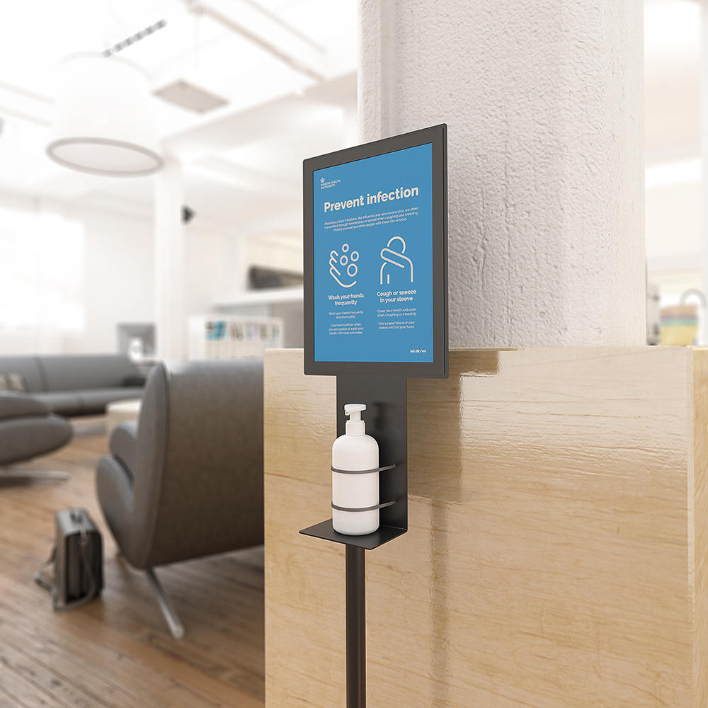 Borne autoportante pour la désinfection des mains, fourni avec un cadre aimanté, format A4, pour changer facilement les informations.