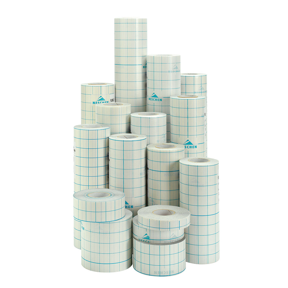 Film plastique autocollant, transparent, brillant, souple. Adhérence immédiate, non repositionnable.