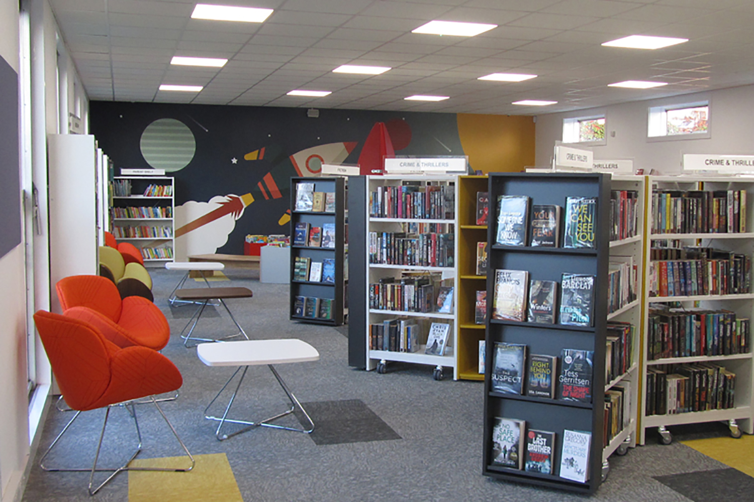 "Merci pour le design et le mobilier remarquables que vous avez fournis à la bibliothèque de Newport Pagnell. Nous avons commencé à remettre tous les livres en place sur les étagères hier et tous les employés de la bibliothèque qui nous ont aidés ont dit à quel point la bibliothèque avait l'air superbe et qu'elle avait le facteur "wow" – en particulier la fusée et les illustrations murales de la section jeunesse".