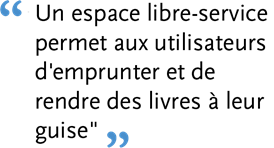 LGSS a demandé que la bibliothèque soit “automatisée”, car le personnel n'est pas toujours disponible. Un espace libre-service permet aux usagers d'emprunter et de rendre des livres à leur guise.