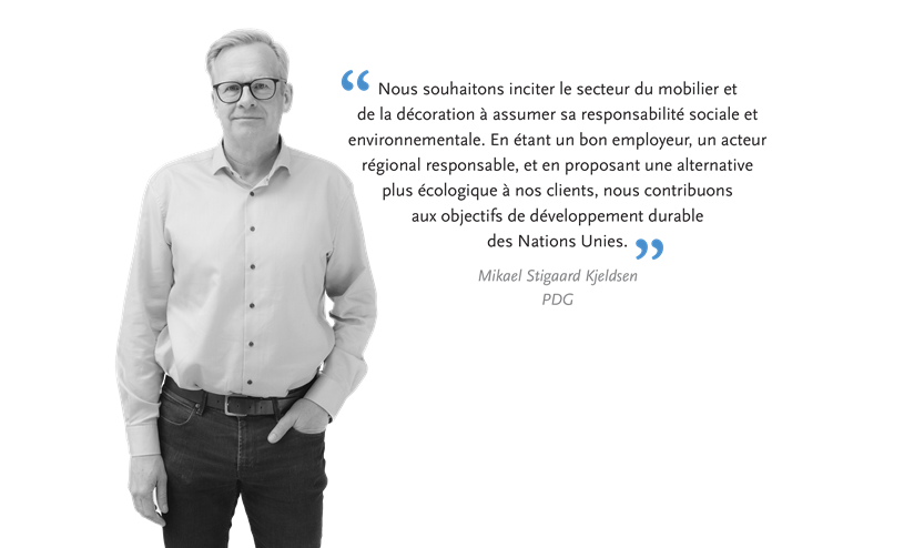 Nous contribuons aux objectifs de développement durable des Nations unies en incitant le secteur de l'ameublement et du design intérieur à assumer une responsabilité environnementale et sociale, en étant un employeur de qualité, un acteur régional engagé et en aidant nos clients à accroître leur engagement en faveur du développement.
