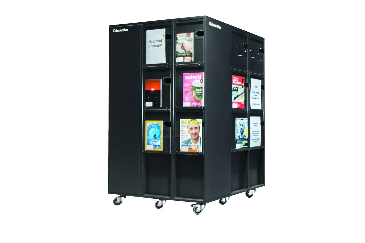 Le système Ordrup Square est une unité combinant réserves et présentoirs à périodiques en roulletes. Il est basée sur les panneaux verticaux Lingo avec des panneaux et des portes avec un présentoir plexi. Derrière les portes avec présentoir plexi, vous trouverez une réserve assez spacieuse pour un format A4 vertical, pour les anciens numéros.