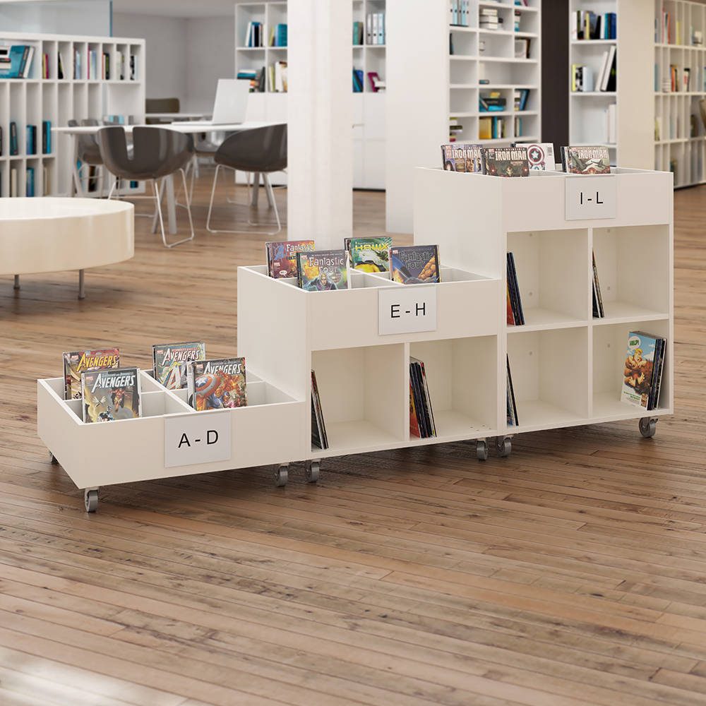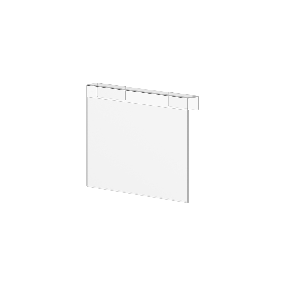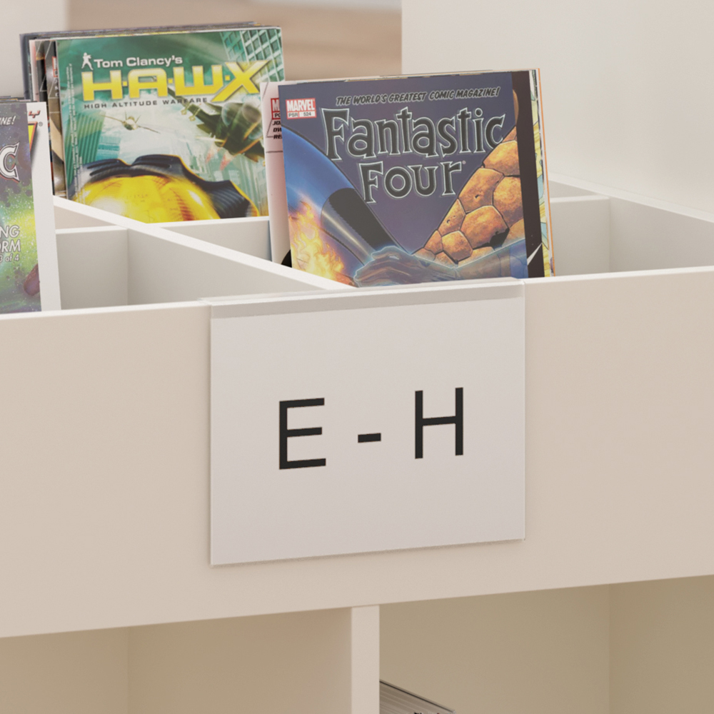 Porte affiche en acrylique anti-reflet pour panneau d’extrémité de rayonnage bois (max 22 mm) ou bac à livres (max 20 mm).