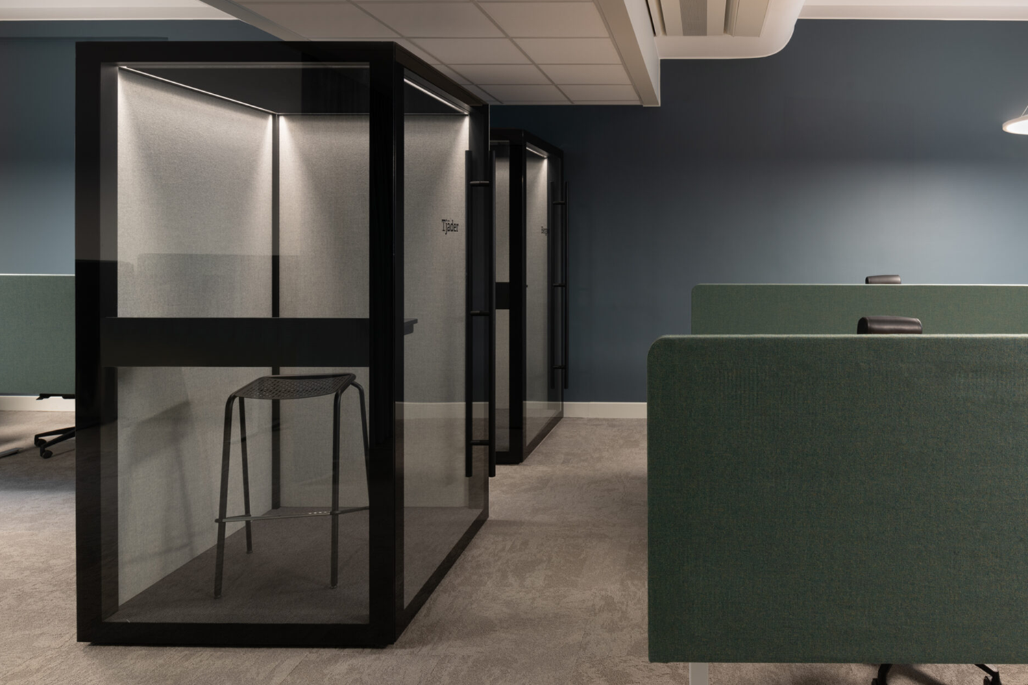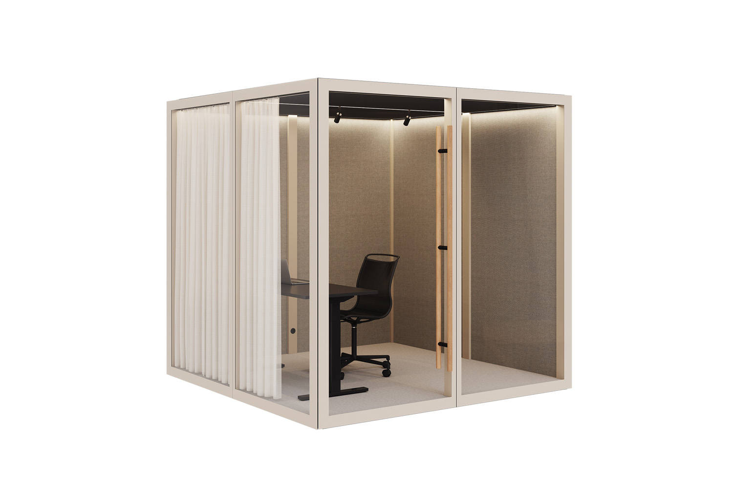 Zen Pod® combine une technologie avancée d’isolation acoustique avec un design élégant. Deux parois sont composées de verre acoustique, tandis que les autres murs, recouverts de textiles à l’intérieur comme à l’extérieur, garantissent une excellente absorption sonore. Le plafond, quant à lui, offre une isolation phonique supplémentaire et intègre un éclairage doux et agréable.